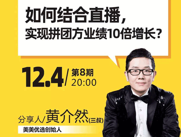 12月4日晚8点,第八期“沸点之夜”正式与大家见面了,本期的分享嘉宾是美美优选创始人黄介然(三叔)。他以“如何结合直播,实现拼团方业绩10倍增长?”为主题,为我们带来了精彩的分享。