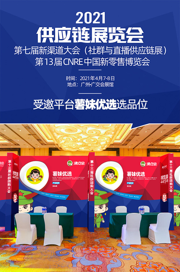 2021供应链展览会,现场采购选品,嘉宾分享干货,现场对接,学习交流,都能满足您的需求,薯妹优选诚邀供货商朋友带着产品来展位洽谈合作。