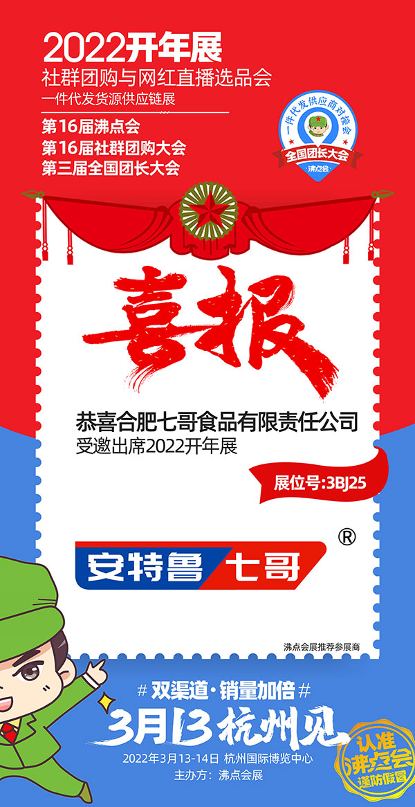 2022年3月13-14日,在杭州国际博览中心隆重举办的2022杭州团长大会分为3大馆,6大展区:美妆护肤展区、百货家居小家电展区、服装饰品箱包鞋帽展区、母婴童装玩具展区、食品零食展区、农特生鲜展区。如此盛典,合肥七哥食品有限责任公司(以下称“合肥七哥食品”)受邀参展此次活动。