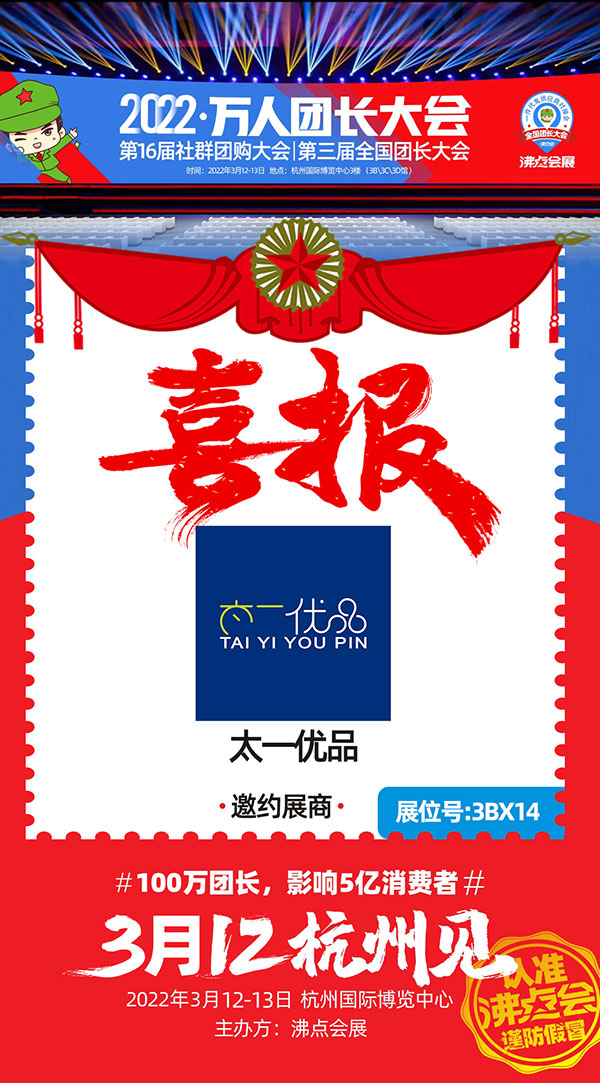 2022杭州全国团长大会,一件代发货源对接会即将于3月12-13日在杭州国际博览中心举办,届时,涵盖了美食、美妆、母婴、零食、服装、百货、小家电、特产生鲜等各类适合社群团购和直播电商的一件代发一手货源将竞相亮相,汕头市太一优品供应链管理有限公司亮相本次展会。