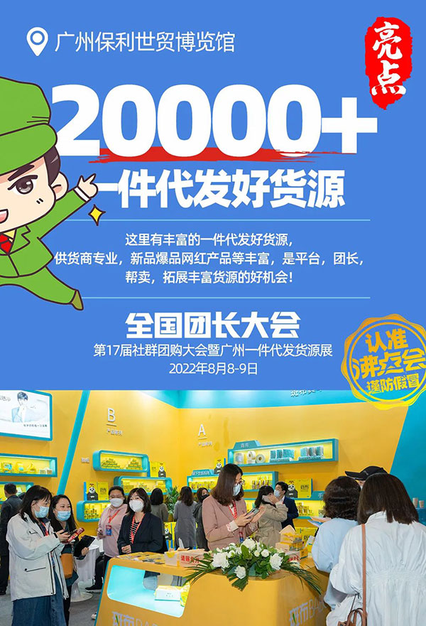 第4届全国团长大会同期举办广州一件代发货源展,有食品馆,百货馆,服装馆,美妆馆,母婴馆,小家电馆等多个分馆,产品类别丰富。